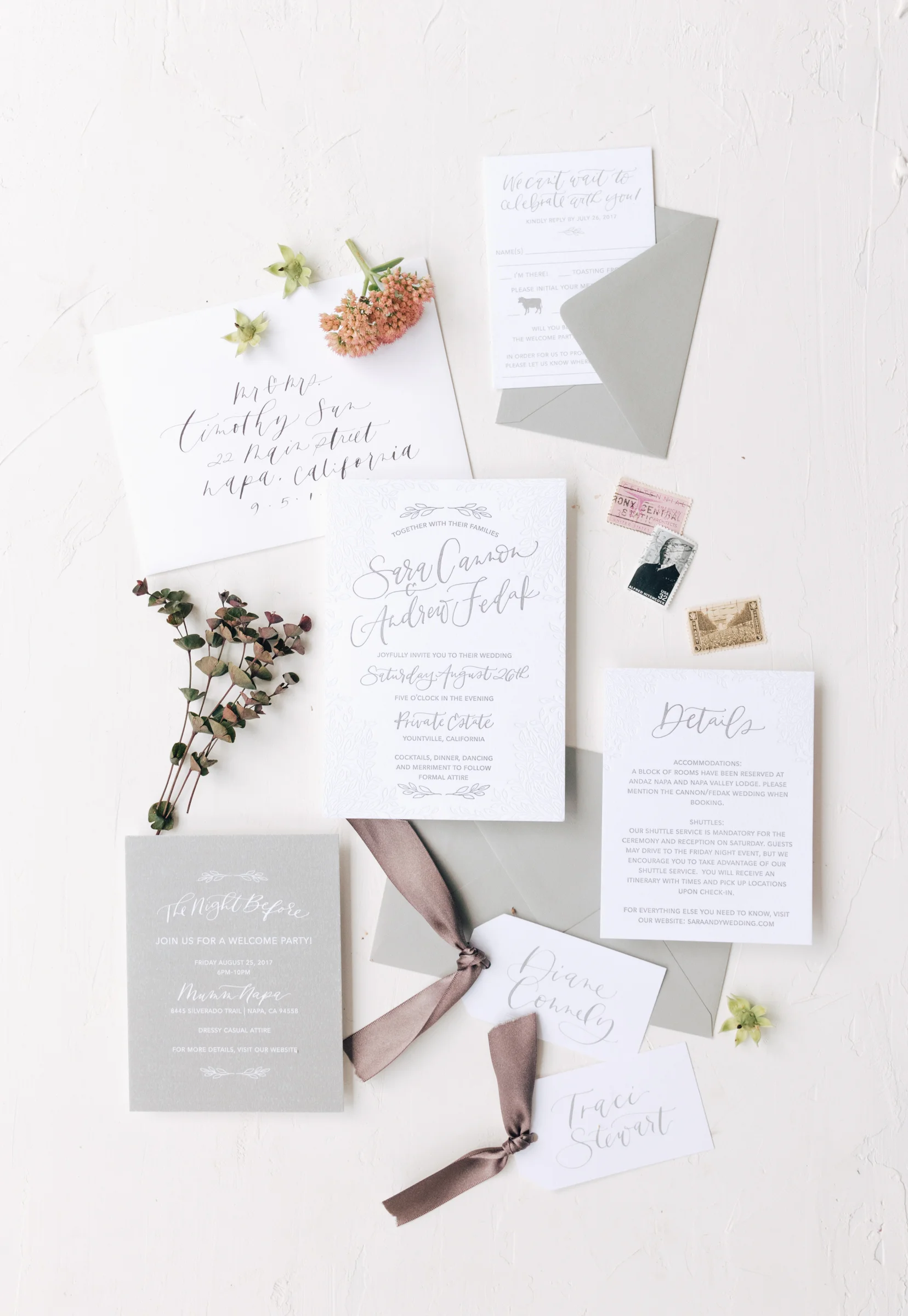 This suite was all about subtle elegance. We created a gorgeous organic texture with blind letterpress leaves and accented it with a modern calligraphy style. An ombre grey palette brought the suite together.